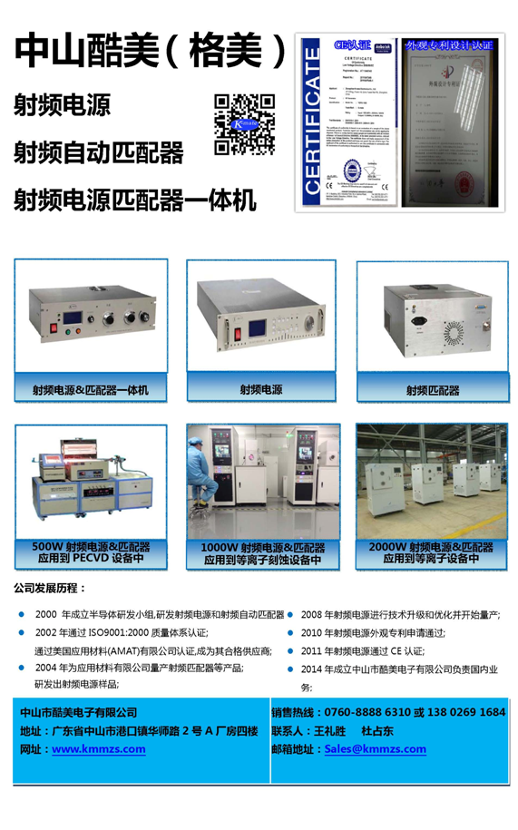 中山市酷美電子有限公司是一家專業(yè)從事半導(dǎo)體制造設(shè)備研發(fā)、設(shè)計(jì)和制造的高科技合資企業(yè)。產(chǎn)品主要有射頻電源、射頻自動(dòng)匹配器、射頻功率分配器,廣泛用于太陽(yáng)能光伏系統(tǒng)、PECVD、真空鍍鏌、刻蝕等真空設(shè)備當(dāng)中。公司于2000年進(jìn)入半導(dǎo)體領(lǐng)域,已有15年豐富的行業(yè)經(jīng)驗(yàn)。2002年,成為全球最大的半導(dǎo)體設(shè)備制造商AMAT(美國(guó)應(yīng)用材料公司APPLIED MATERIALS INC)認(rèn)證的供應(yīng)商,并為AMAT大批量制造射頻匹配器等產(chǎn)品,每年DMR比率控制在1%之內(nèi)。